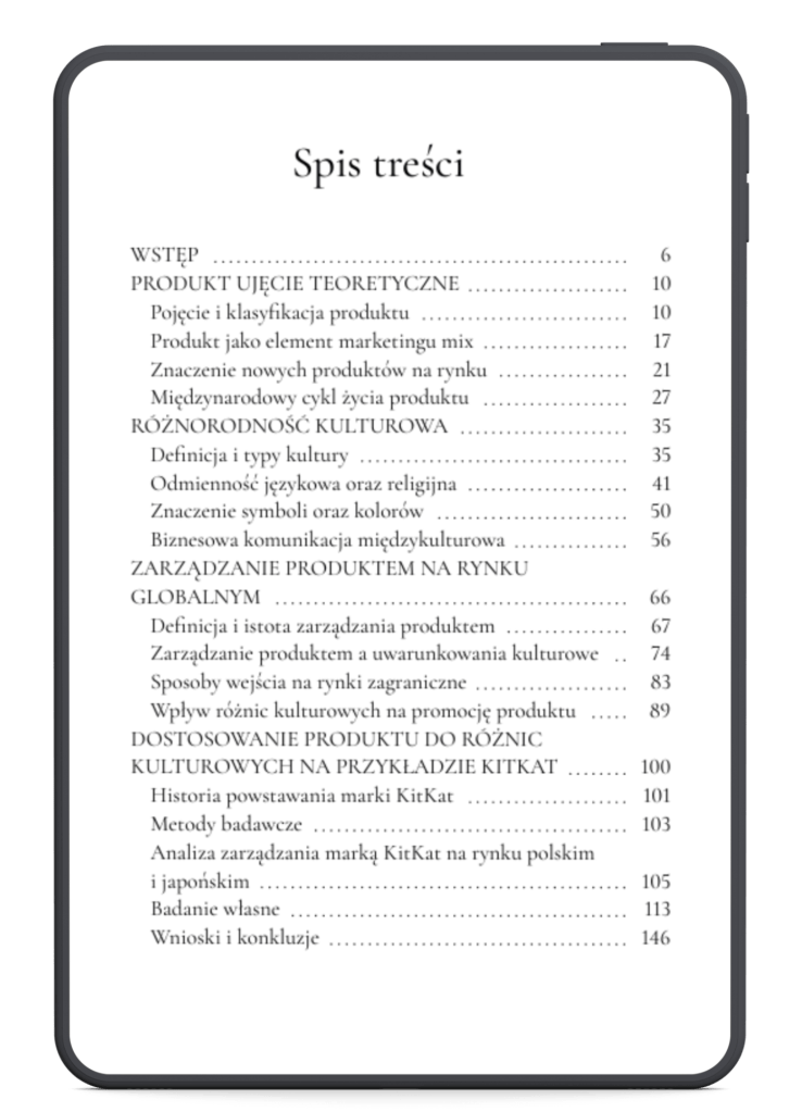 W międzynarodowym biznesie sukces produktu zależy dziś nie tylko od jakości czy ceny, ale także od tego, jak jest postrzegany w różnych kontekstach kulturowych. Czasem o powodzeniu marki decyduje detal — kolor opakowania, liczba sztuk w zestawie, nazwa czy przekaz reklamowy. Książka ta bada wpływ różnic kulturowych na strategię zarządzania produktem, łącząc teorię marketingu z konkretnym przykładem marki KitKat, która w Japonii osiągnęła niemal kultowy status.